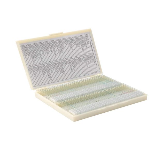 Box set of prepared slides, including plants, insects and animal tissues, for use in biological education. Selected fine specimens from various categories. Samples are sealed with a coverslip to preserve specimen and prevent contamination. Clear glass for clear viewing. Labeling provides clear specimen identification. Slides are packed in a fitted wooden box for easy handling and preventing breakage.